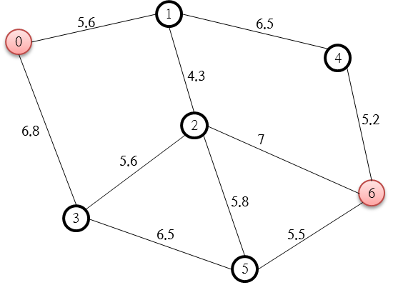 BFS A star 알고리즘을 활용해 아래 그림과 같이 출발점이 0 인 노드에서 도착점이 6 인 노드까지의 최단거리를 구해보자.