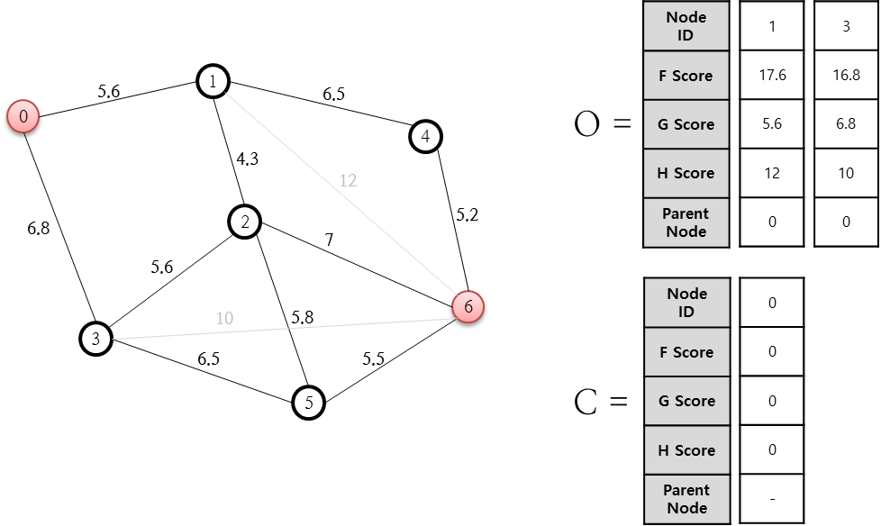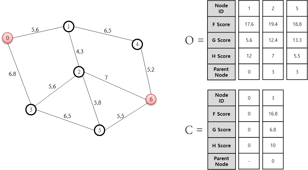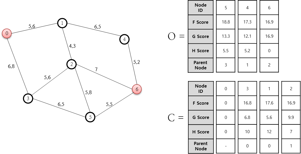 예를들어 0번 노드에서 1번 노드까지의 거리는 5.6 이며, 1 번 노드에서 6 번 노드까지의 휴리스틱 추정값은 12 이므로,