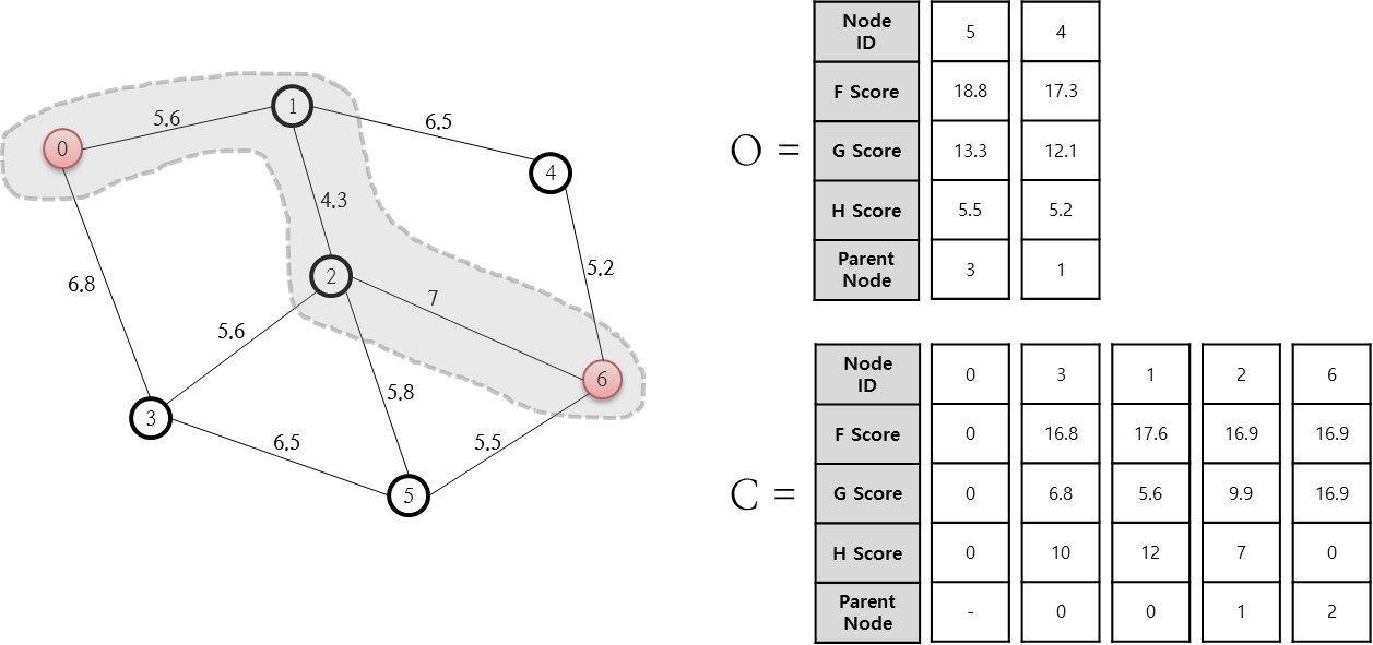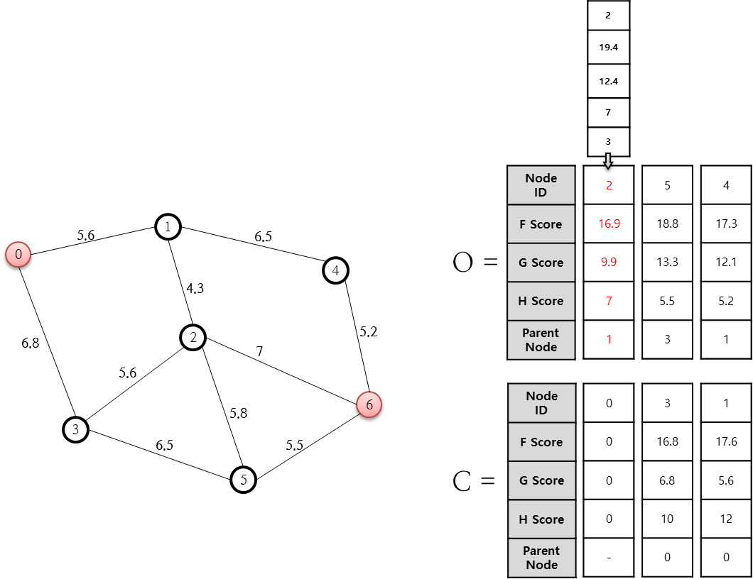1번 노드와 연결되어있는 노드는 2번과 4번이다. 하지만 2번은 이미 O 배열안에 존재한다. 이때 0 - 1 - 2 경로를 탔을때 간선의 가중치는 9.9 이며, 이는 기존에 존재하는 0 - 3 - 2 를 탔을때의 간선의 가중치인 12.4 보다 작은 값이다. 즉, 새로운 G score 의 값이 기존에 존재하는 G score 의 값보다 작다면 더 작은 값으로 갱신해준다.