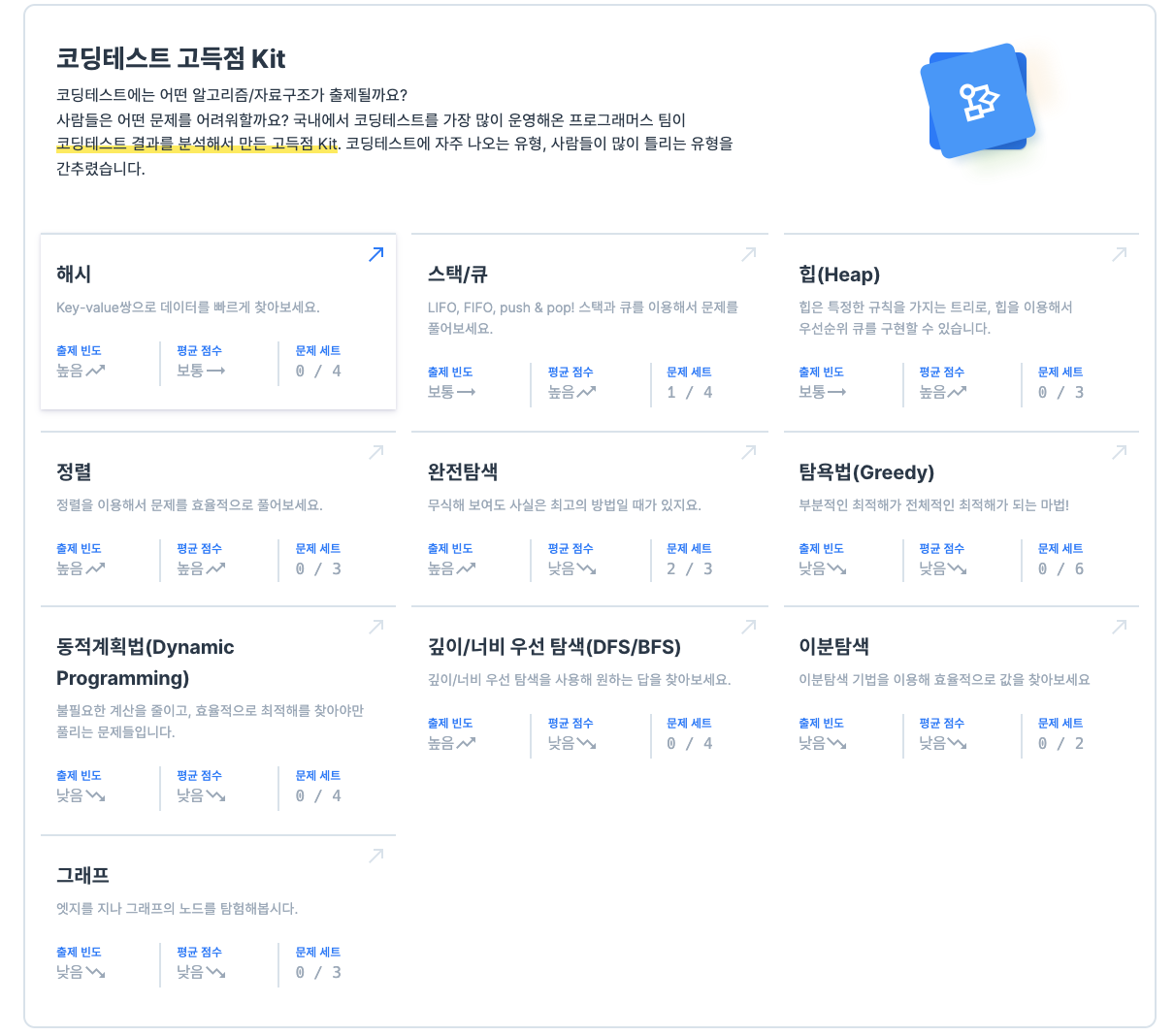 도대체 어떻게 공부해야할지 잘 감이 안잡혀서 일단 프로그래머스에 있는 고득점kit 먼저 전부 다 풀어보기로 했다.