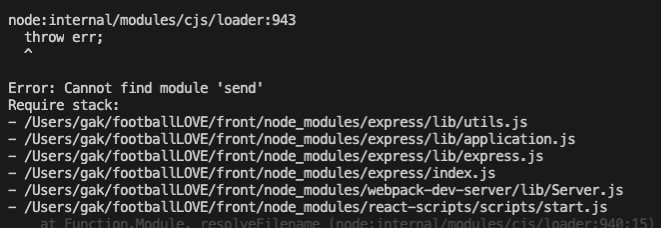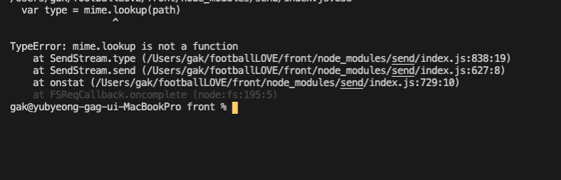 var charset = mime.getType(type) 이렇게 수정한 뒤,(.charset 을 없앰)다시 실행했다.9. 이번엔 'send' 라는 모듈을 찾을 수 없다는 에러