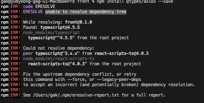 "npm install --legacy-peer-deps" 로 디펜던시 문제를 확인할 수있다.