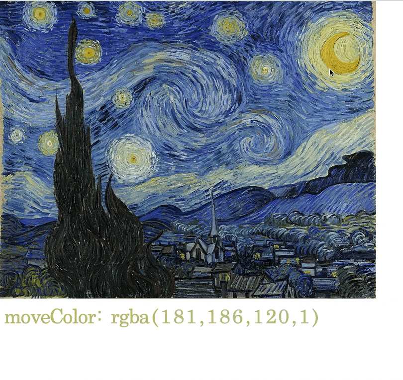 this.img = new Image(); this.img.src = "./starryNight.jpeg"; this.img.onload = () => { this.ctx.drawImage(this.img, 0, 0); };2.마우스 위치에 있는 컬러 추출하기getImageData(mouseX, mouseY, 1, 1); 로 마우스가 있는 곳의 이미지 픽셀 데이터를 가져올 수 있으며 해당 픽셀 데이터는 4개의 r,g,b,a 로 구성된 배열이다.